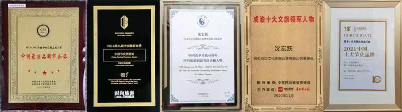 2017年7月,自貢燈會(huì)在第六屆中國(guó)民族節(jié)慶峰會(huì)暨“2017中國(guó)優(yōu)秀民族節(jié)慶”評(píng)選活動(dòng)中榮獲“最具國(guó)際影響力”大獎(jiǎng),公司總經(jīng)理、自貢燈會(huì)總策劃師沈宏躍獲“2017年度優(yōu)秀節(jié)慶人物”殊榮。