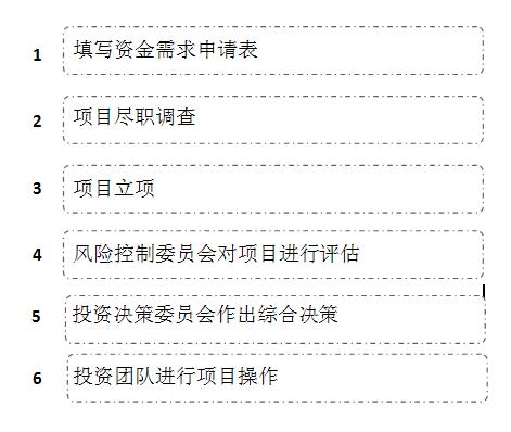 申請及項目流程:1、填寫資金需求申請表 2、項目盡職調(diào)查 3、項目立項 4、風險控制委員會對項目進行評估 5、投資決策委員會作出綜合決策 6、投資團隊進行項目操作